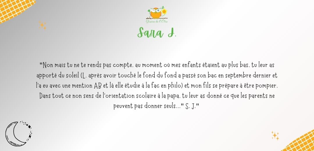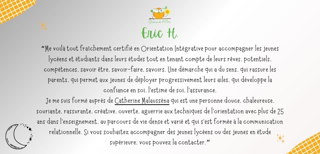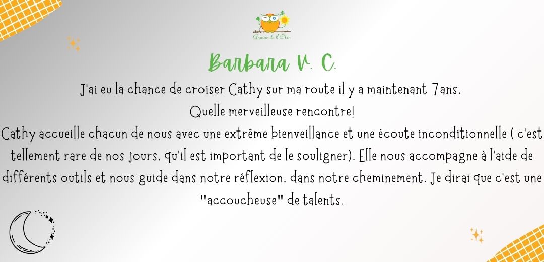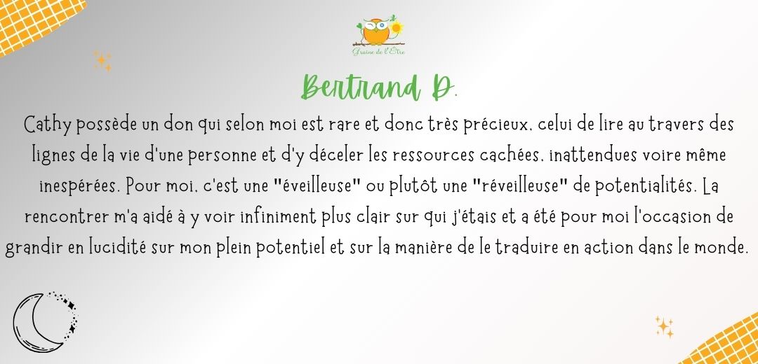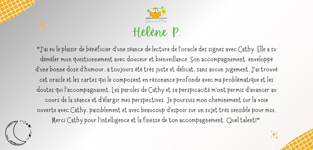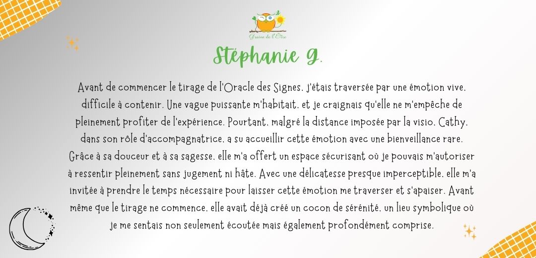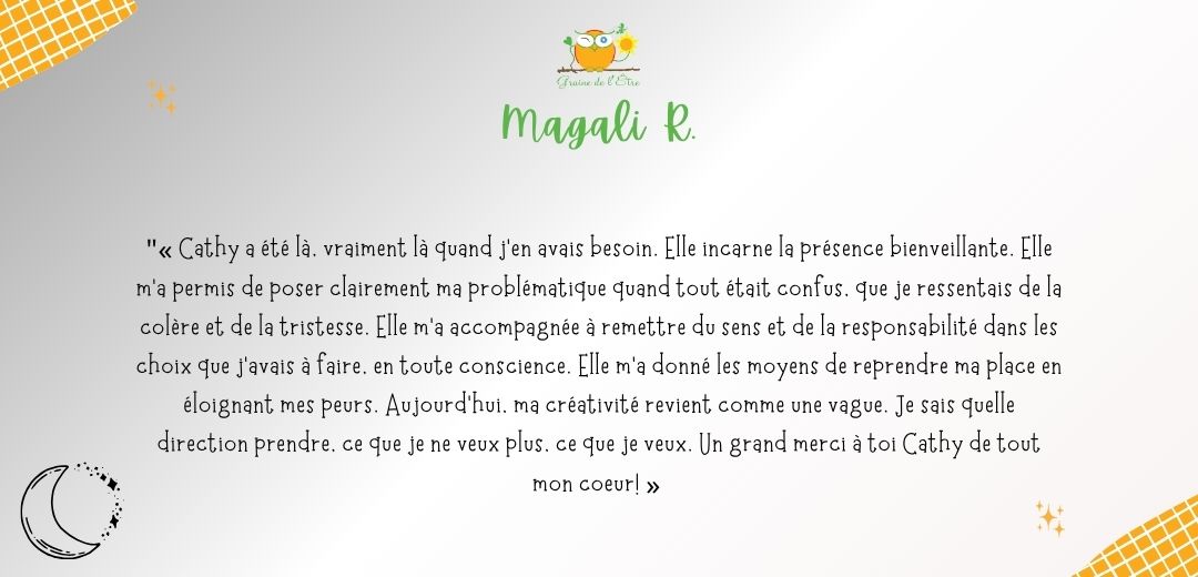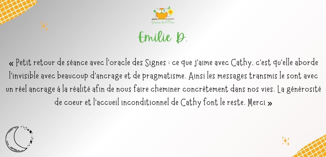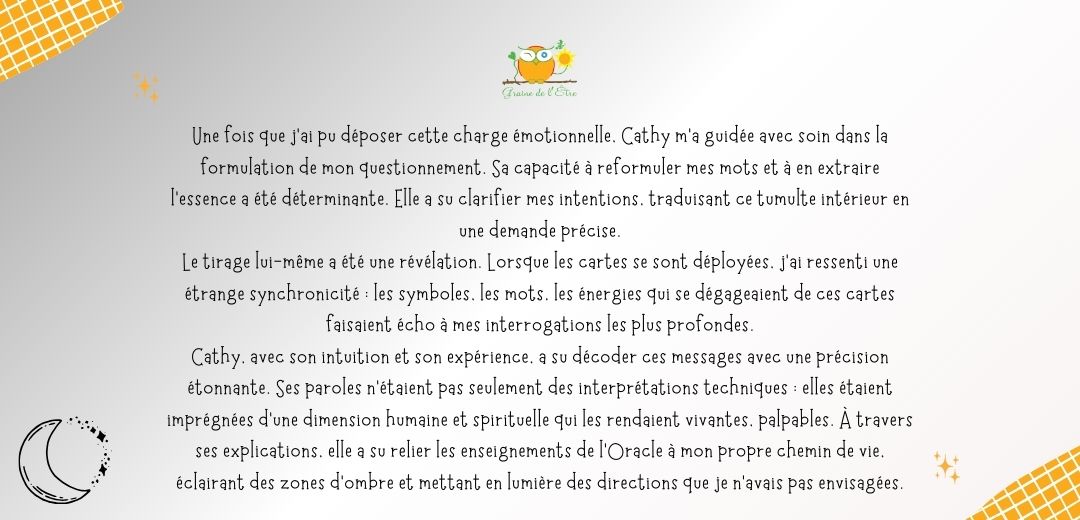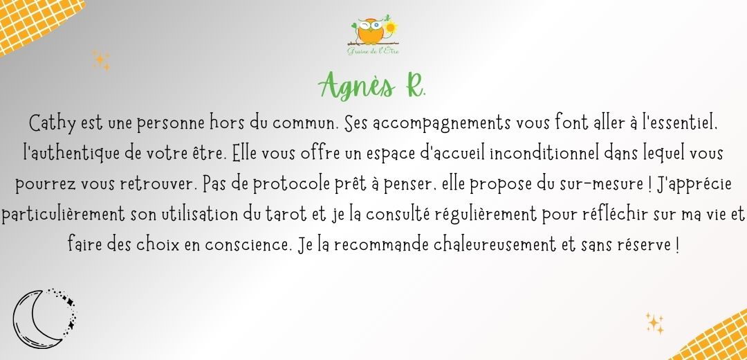 A ce jour, je ne me lasse pas d’en découvrir la symbolique à travers mes lectures, mon approche du tarot de Marseille ou d’oracles inspirants. A travers Graine de l’Être, je vous accompagne à explorer vos profondeurs, exprimer vos potentiels à travers l’Orientation Intégrative®, et favoriser l’émergence de votre créativité via la Bibliothérapie créative et la tarologie.