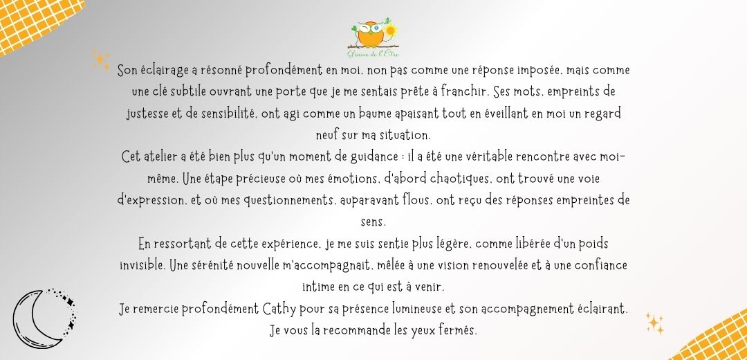 Après une Maîtrise de Lettres suivie d’une formation en Ingénierie Documentaire, puis une carrière d’enseignante qui m’a offert de partager mon amour des livres à une enfance avide d’en expérimenter la magie, ce sont des rencontres impactantes qui m’ont amenée sur le chemin de l’étoile, via la révélation de ma capacité à entrer en contact avec le subtil.
